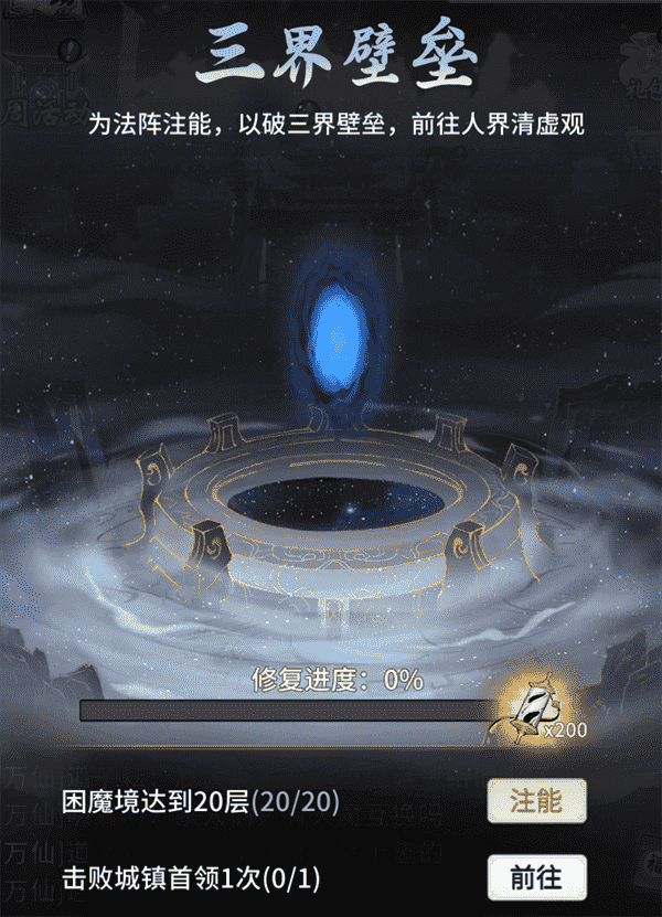 当你修为达到返虚/破虚中期后,,可在城镇寻得芸丫并激活神秘法阵,,,,通过收集材料、、、击败首领等方式为法阵注能,,,借以打破三界壁垒,,开启支线剧情“清虚旧梦”